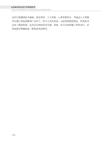机械自动化设计与制造研究 Research on Mechanical Automation Design and Manufacturing 坚持以控制理论为基础,将生理学、人工智能、心理学相结合,再通过人工智能 来实现自动化诊断和产品加工。但不可否认的是,目前的智能化机电一体化技术 还处于摸索阶段,还没有得到很好的实施,因此,在今后的机械工程发展中,必 须加强对智能机电一体化技术的研发。 178 178