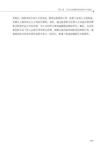 第六章 汽车电机驱动系统设计与技术 养观念,加强对综合型人才的引进,落实岗前培训工作,加强专业型人才的筛选, 从源头上提升相关人才的综合素质;其次,通过技术研讨会和人才交流会等多种 形式推进专业人才的培养,为人才的学习和沟通提供高效的平台;最后,充分发 挥经验丰富工作人员的引导和领头作用,加强对相关技术团队的培训和引导,避 免相关技术团队在研发过程中步入一些误区,客观上推进新能源汽车的研发。 203 203