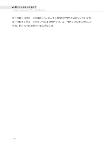 计算机技术与网络安全研究 Computer Technology and Cyber Security Research 教育和社会化培训,不断增强公民、法人和其他组织的网络和信息安全保护意识, 提升全民数字素养,在全社会形成重视网络安全、遵守网络安全法律法规的良好 氛围,推动我国商用密码事业高质量发展。 170 170