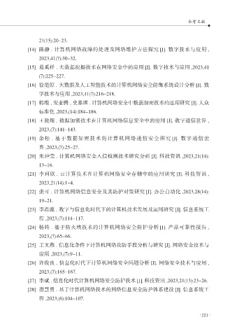 [20] 朱珅莹 . 计算机网络安全入侵检测技术研究分析 [J]. 科技资讯 ,2023,21(14):