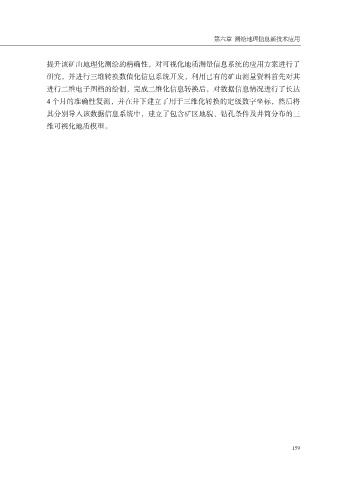 第六章 测绘地理信息新技术应用 提升该矿山地理化测绘的精确性,对可视化地质测量信息系统的应用方案进行了 研究,并进行三维转换数值化信息系统开发,利用已有的矿山测量资料首先对其 进行二维电子图档的绘制,完成二维化信息转换后,对数据信息情况进行了长达 4 个月的准确性复测,并在井下建立了用于三维化转换的定级数字坐标,然后将 其分别导入该数据信息系统中,建立了包含矿区地貌、钻孔条件及井筒分布的三 维可视化地质模型。 159