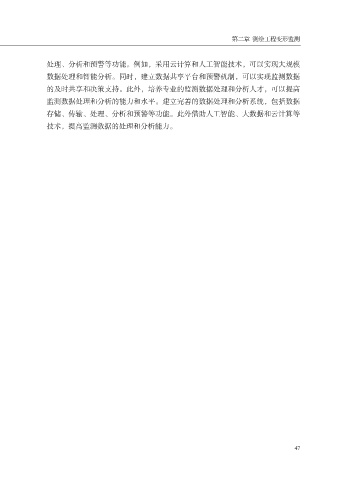 第二章 测绘工程变形监测 处理、分析和预警等功能。例如,采用云计算和人工智能技术,可以实现大规模 数据处理和智能分析。同时,建立数据共享平台和预警机制,可以实现监测数据 的及时共享和决策支持。此外,培养专业的监测数据处理和分析人才,可以提高 监测数据处理和分析的能力和水平。建立完善的数据处理和分析系统,包括数据 存储、传输、处理、分析和预警等功能。此外借助人工智能、大数据和云计算等 技术,提高监测数据的处理和分析能力。 47