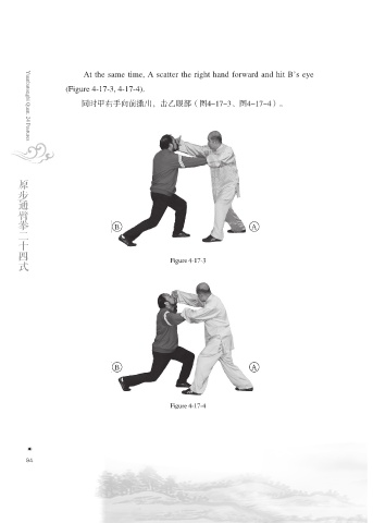 At the same time, A scatter the right hand forward and hit B’s eye (Figure 4-17-3, 4-17-4). 同时甲右手向前撒出,击乙眼部(图4-17-3、图4-17-4)。 Yuanbutongbi Quan: 24 Postures 原步通臂拳二十四式 B A Figure 4-17-3 B A Figure 4-17-4 94