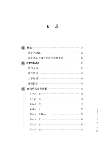 目 录 壹 概述 01 通臂拳源流 03 通臂拳二十四式拳法和演练要求 10 贰 武术图解说明 13 动作方向 15 动作路线 15 文字说明 16 要领提示 17 叁 套路单式动作详解 19 第一式 斩 23 第二式 拦 25 第三式 横 27 第四式 卡 35 Contents 第五式 鞠躬八打 38 目 第六式 劈 42 录 第七式 撩 45 第八式 掖 47 05