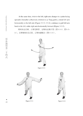 同时向左拧转,右臂变阳掌,左臂向左侧平展(图3-3-3、图3-3-