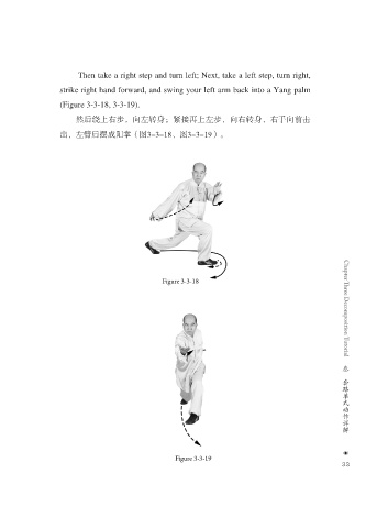 出,左臂后摆成阳掌(图3-3-18、图3-3-19)。