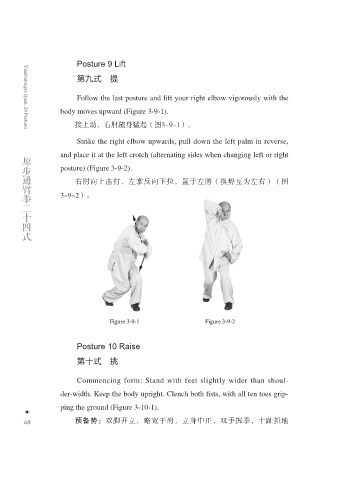 右肘向上击打,左掌反向下拉,置于左胯(换势互为左右)(图