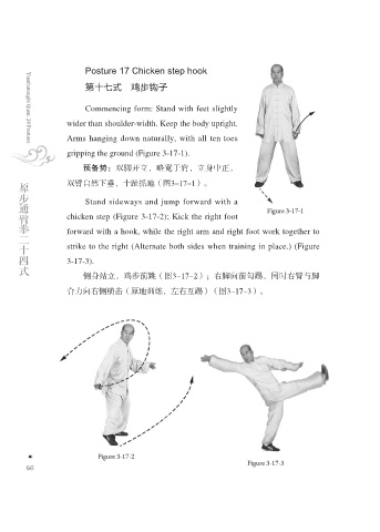 侧身站立,鸡步前跳(图3-17-2);右脚向前勾踢,同时右臂与脚