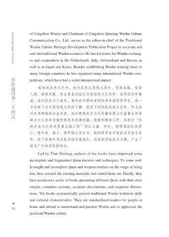sort out traditional Wushu resources. He has led teams for Wushu exchang-