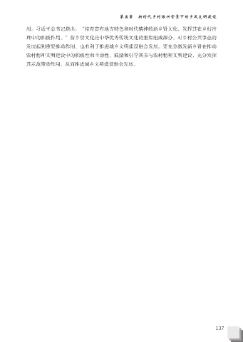 第五章 新时代乡村振兴背景下的乡风文明建设 用。习近平总书记指出:“培育富有地方特色和时代精神的新乡贤文化,发挥其在乡村治 理中的积极作用。”新乡贤文化是中华优秀传统文化的重要组成部分,对乡村公共事业的 发展起到重要推动作用,也有利于推进城乡文明建设融合发展。要充分激发新乡贤在推动 农村精神文明建设中的积极性和主动性,鼓励和引导其参与农村精神文明建设,充分发挥 其示范带动作用,从而推进城乡文明建设融合发展。 137