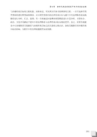第七章 新时代新农村建设下的乡村社会治理 与治理有效目标的关联机制。具体来说,可从两方面来考察两者的关联:一方面选择不同 类型农村进行典型案例深描,对不同类型农村的治理有效目标与健全乡村治理体系的实践 路径进行分析、汇总、整理;另一方面通过问卷调查收集数据进行计量分析,考察社会、 政治、文化不同路径下健全乡村治理体系与治理有效目标实现的差异。总之,需要形成健 全乡村治理体系实践路径与治理有效目标之间关系的完整认识,强化实践路径对治理有效 目标的影响,为提升乡村治理效能提供实证依据。 201