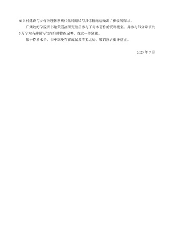 丽乡村建设与乡村治理体系现代化的路径与具体措施也做出了积极的探寻。 广州航海学院图书馆荣霞副研究馆员参与了对本著作的资料搜集,并参与部分章节共 5 万字左右的撰写与内容的修改完善,在此一并致谢。 限于作者水平,书中难免存在疏漏及不妥之处,敬请读者批评指正。 2023 年 7 月