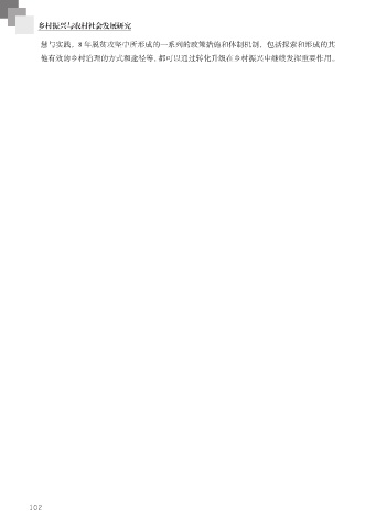 乡村振兴与农村社会发展研究 慧与实践,8 年脱贫攻坚中所形成的一系列的政策措施和体制机制,包括探索和形成的其 他有效的乡村治理的方式和途径等,都可以通过转化升级在乡村振兴中继续发挥重要作用。 102
