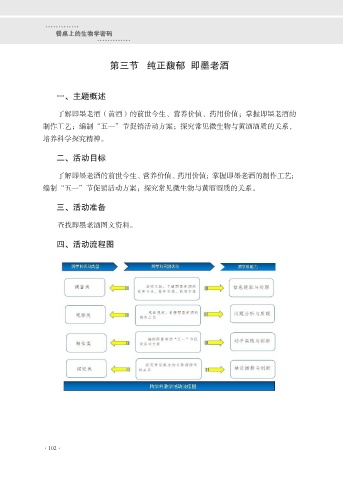 ············· 餐桌上的生物学密码 ············· 第三节 纯正馥郁 即墨老酒 一、主题概述 了解即墨老酒(黄酒)的前世今生、营养价值、药用价值;掌握即墨老酒的 制作工艺;编制“五一”节促销活动方案;探究常见微生物与黄酒酒质的关系, 培养科学探究精神。 二、活动目标 了解即墨老酒的前世今生、营养价值、药用价值;掌握即墨老酒的制作工艺; 编制“五一”节促销活动方案;探究常见微生物与黄酒酒质的关系。 三、活动准备 查找即墨老酒图文资料。 四、活动流程图 ·102·
