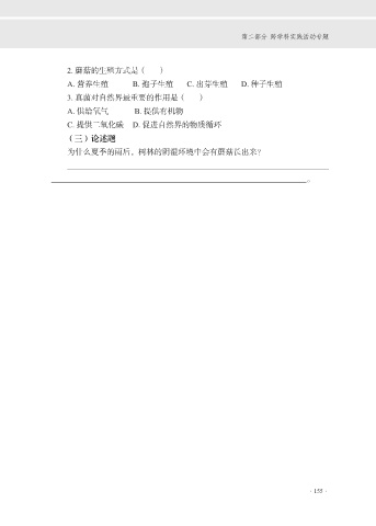 第二部分 跨学科实践活动专题 2. 蘑菇的生殖方式是( ) A. 营养生殖 B. 孢子生殖 C. 出芽生殖 D. 种子生殖 3. 真菌对自然界最重要的作用是( ) A. 供给氧气 B. 提供有机物 C. 提供二氧化碳 D. 促进自然界的物质循环 (三)论述题 为什么夏季的雨后,树林的阴湿环境中会有蘑菇长出来? 。 ·155·