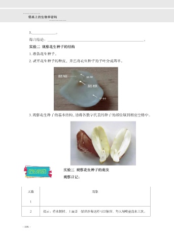 ············· 餐桌上的生物学密码 ············· 5. 。 得出结论: 。 实验二 观察花生种子的结构 1. 准备花生种子。 2. 剥开花生种子的种皮,并且将花生种子的子叶分成两半。 3. 观察花生种子的基本结构,请将各数字代表的种子的部位填到相应空格中。 实验三 观察花生种子的萌发 观察日记: 天数 现象 1 2 提示:将水倒掉,上面盖一层湿沙布这样可以保湿,每天用喷壶浇水三次。 ·198·