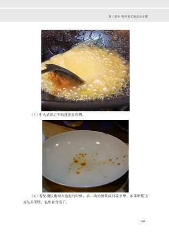 第二部分 跨学科实践活动专题 (3)中火煮溶后不断搅拌至浓稠。 (4)看见糖浆出现大泡泡的时候,取一滴的糖浆滴到凉水里,如果糖浆迅 速结晶变硬,温度就合适了。 ·209·