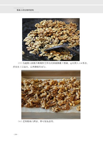 ············· 餐桌上的生物学密码 ············· (5)迅速倒入核桃不断翻炒至所有的核桃都裹上糖液,这时倒入 1/4 杯水, 煮至水干后熄火,让焦糖挂得更匀。 (6)把核桃盛出摊凉,即可装瓶食用。 ·210·