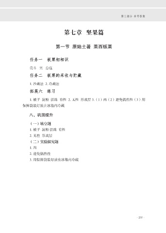 第三部分 参考答案 第七章 坚果篇 第一节 原始土著 莱西板栗 任务一 板栗初相识 壳斗 栗 总苞 任务二 板栗的采收与贮藏 1. 沙藏法 2. 冷藏法 拓展六 练习 1. 被子 淀粉 胚珠 有性 2. 无性 形成层 3.(1)两(2)避免偶然性(3)用 保鲜袋装好放在冰箱内冷藏 八、巩固提升 (一)填空题 1. 被子 淀粉 胚珠 有性 2. 无性 形成层 (二)实验探究题 1. 两 2. 避免偶然性 3. 用保鲜袋装好放在冰箱内冷藏 ·235·