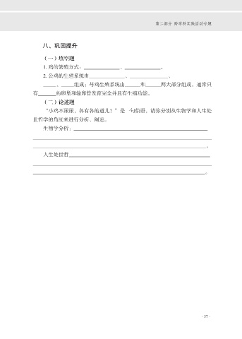 第二部分 跨学科实践活动专题 八、巩固提升 (一)填空题 1. 鸡的繁殖方式: 、 。 2. 公鸡的生殖系统由 、 、 、 组成;母鸡生殖系统由 和 两大部分组成,通常只 有 的卵巢和输卵管发育完全并且有生殖功能。 (二)论述题 “小鸡不尿尿,各有各的道儿!”是一句俗语,请你分别从生物学和人生处 世哲学的角度来进行分析、阐述。 生物学分析: 。 人生处世哲 。 ·57·