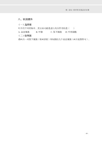 第二部分 跨学科实践活动专题 八、巩固提升 (一)选择题 叶片的下列结构中,其主要功能是进行光合作用的是( ) A. 表皮细胞 B. 叶脉 C. 保卫细胞 D. 叶肉细胞 (二)绘图题 请画出一对保卫细胞(要画详细)和周围的几个表皮细胞(画出轮廓即可)。 ·89·