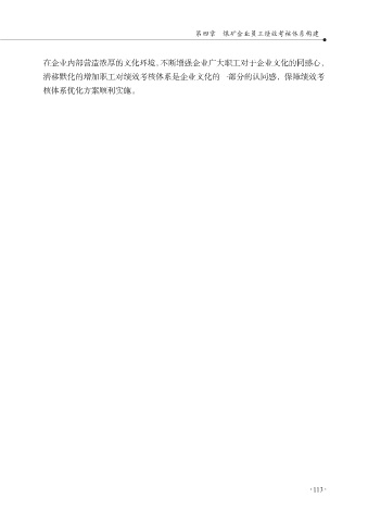 第四章 煤矿企业员工绩效考核体系构建 在企业内部营造浓厚的文化环境,不断增强企业广大职工对于企业文化的同感心, 潜移默化的增加职工对绩效考核体系是企业文化的一部分的认同感,保障绩效考 核体系优化方案顺利实施。 1 113 13