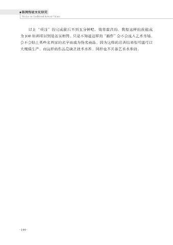 韩国传统文化研究 Studies on Traditional Korean Culture 以上“项目”的完成前后不到五分钟吧,效率蛮高的,我想这样的技能成 为 JOB 培训项目倒是名实相符。只是不知道这样的“画作”会不会流入艺术市场, 会不会贴上某些名画家的名字而成为伪劣商品。因为这样的培训结果很可能可以 大规模生产。而这样的作品是缺乏技术水准,同样也不具备艺术水准的。 144 144