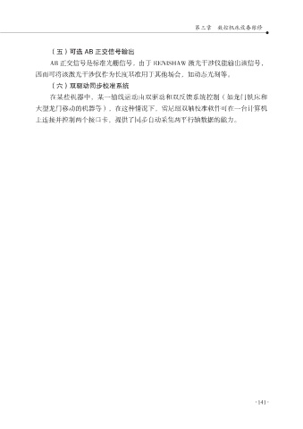 第三章 数控机床设备维修 (五)可选 AB 正交信号输出 AB 正交信号是标准光栅信号,由于 RENISHAW 激光干涉仪能输出该信号, 因而可将该激光干涉仪作为长度基准用于其他场合,如动态光刻等。 (六)双驱动同步校准系统 在某些机器中,某一轴线运动由双驱动和双反馈系统控制(如龙门铁床和 大型龙门移动的机器等),在这种情况下,雷尼绍双轴校准软件可在一台计算机 上连接并控制两个接口卡,提供了同步自动采集两平行轴数据的能力。 141 141