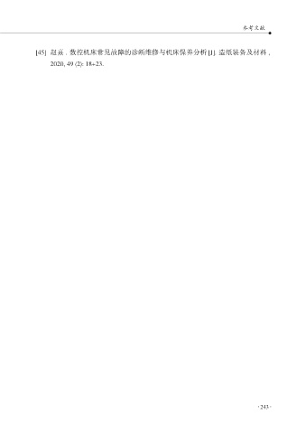 参考文献 [45] 赵熹 . 数控机床常见故障的诊断维修与机床保养分析 [J]. 造纸装备及材料 , 2020, 49 (2): 18+23. 243 243